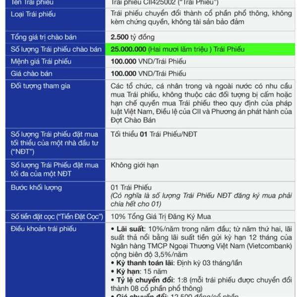 CII chính thức mở đợt chào bán trái phiếu ra công chúng với mức lãi suất cố định 10%/năm áp dụng trong năm đầu tiên. Từ năm thứ hai, lãi suất được điều chỉnh theo cơ chế thả nổi theo quy định tại Bản ...Thêm