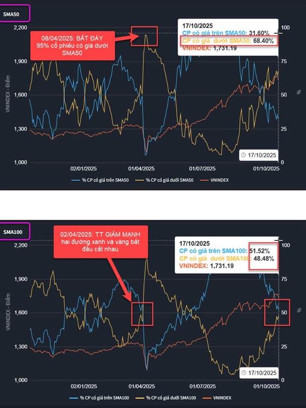 Dữ liệu thống kê cho thấy, khi số cổ phiếu có giá giảm dưới #SMA50 và #SMA100 tăng lên là khi #VNI điều chỉnh.