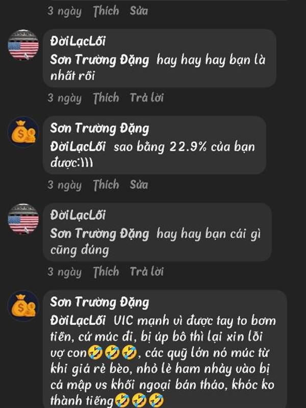 Sơn Trường Đặng lâu lâu , ăn may , tưởng mình tài giỏi , lên mặt dạy đời ... nhưng khi đuối lý thì chửi người khác ng u này ng u nọ ... hạng người như vậy có ra gì đâu , chỉ loại 3 cọc 3 đồng thôi . Như thằng Shark B...Thêm