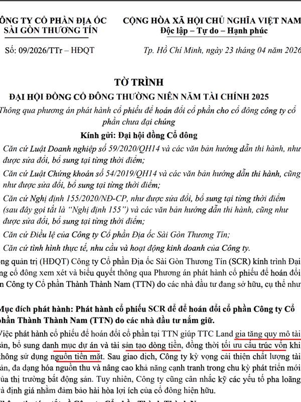 Phát hành cổ phiếu SCR để hoán đổi cổ phần Công ty Cổ phần Thành Thành Nam (TTN) do các nhà đầu tư nắm giữ.
