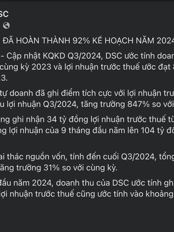 - BCTC Quý 3 khả năng chưa có sớm vậy đâu. Tuy nhiên mảng tự doanh của DSC khá ổn áp