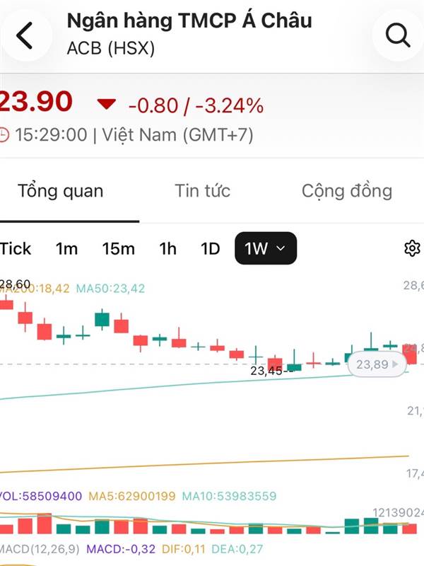 Xét về kỹ thuật thì Chạm Ma50 là 23,45 sẽ Bật. AE để rồi xem đúng hay Sai. ACB lịch sử nó rất ít khi nằm dưới Ma50