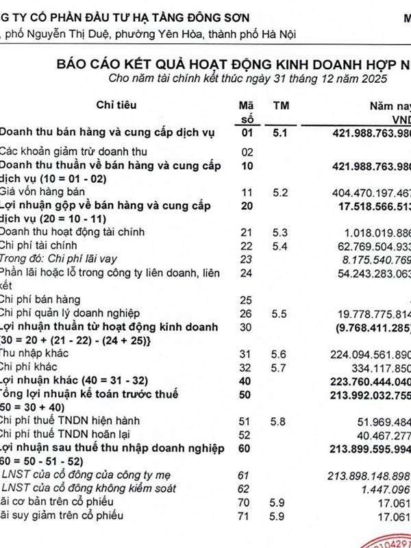 thanhnguyen LNST hợp nhất của công ty mẹ 213 tỷ đồng, của cổ đông thiểu số 1 triệu đồng.