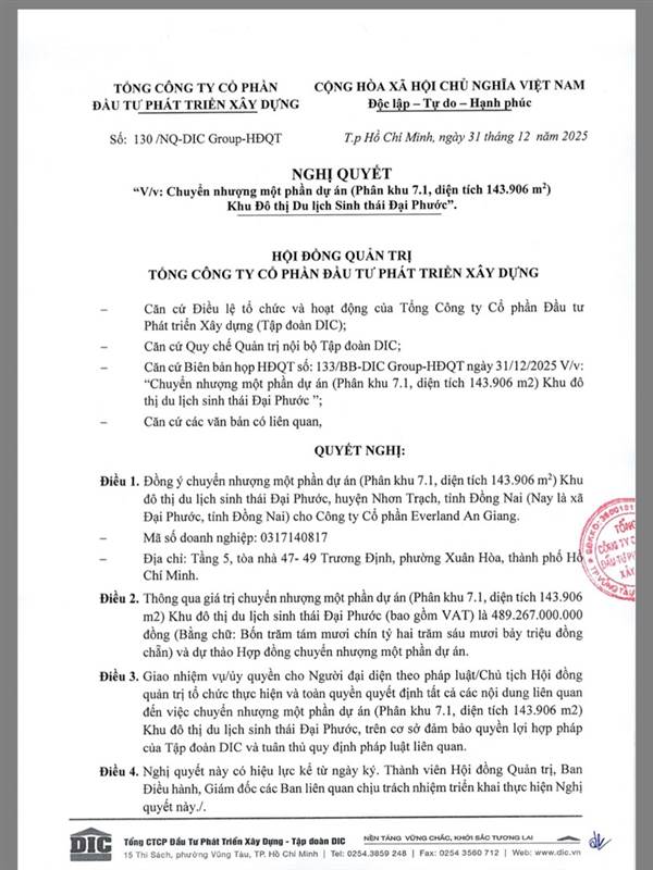 Hội đồng quản trị Tổng Công ty Cổ phần Đầu tư Phát triển Xây dựng (DIC Corp) vừa thông qua nghị quyết chuyển nhượng quyền sử dụng đất tại 4 phân khu thuộc dự án Khu đô thị du lịch sinh thái Đại Phước (Đồng Nai). Với tổng giá trị thương vụ ước tính gần 3.000 tỷ đồng, dòng tiền này được kỳ vọng là yếu tố quyết định giúp doanh nghiệp hoàn thành chỉ tiêu lợi nhuận năm 2025.