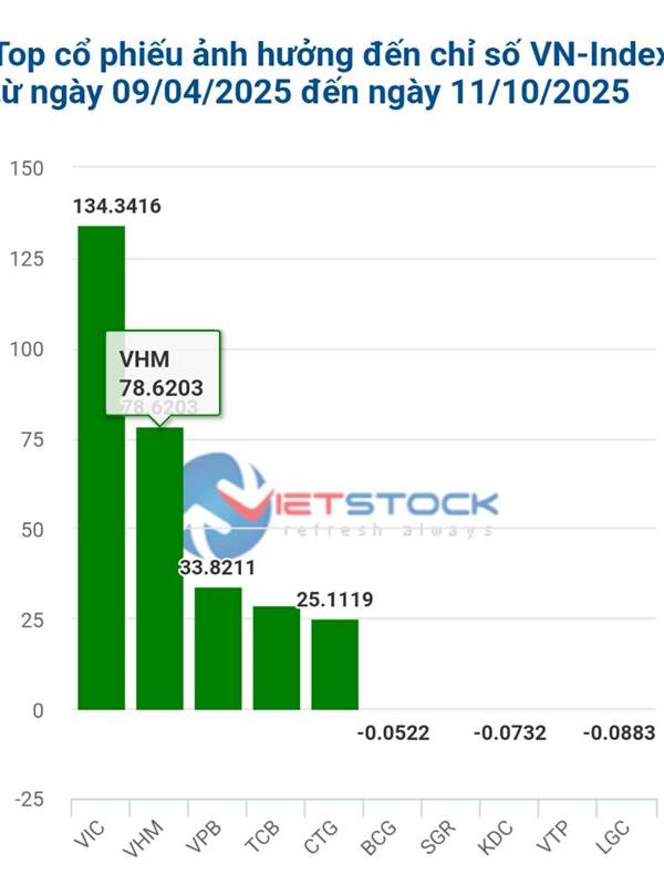 • Đóng góp vào sóng tăng VN-Index: VIC ~315đ; VHM ~137đ; VRE ~29đ; VPL ~1,4đ ⇒ tổng ~482đ = ~71,5%.