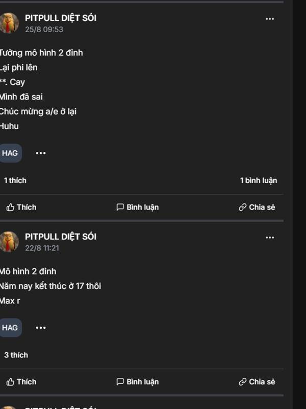 PITPULL DIỆT SÓI tháng 8 mày đã hô hào rồi, tao biết mày mất hàng đu đỉnh mà :))) mày còn nhận mày mua HAG mất hàng đu đỉnh mà, đầu tư VIC GEX CII gì ở đâu hả con :)) xạo lồn" ít thôi, kẻo mai mốt ngta bảo em là thằng...Thêm