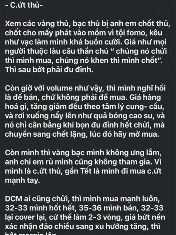 Nên anh em nào đã cầm đoạn từ 32-33 lên 38 xong nó cho 1 gậy về 35 mới sợ. Nhưng tôi thấy nó vừa tích luỹ xong, chạy đà vào chu kỳ đẩy giá, thì có gì mà sập nữa, cùng lắm chậm ăn; nên giữ chặt. Tóm l...Thêm
