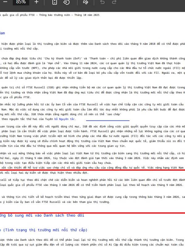 Hết kì vọng: 21.9.2026 mới có hiệu lực công nhận chính thức lên TT mới nổi Thứ cấp nhưng fai trải qua kì đánh giá T3.2026. Phấn đấu 2030 TT mới nổi phát triển bởi MSCI &FTSE