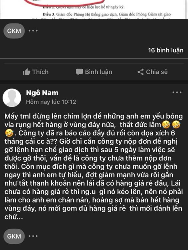 Ngô Nam luật nào đình chỉ giao dịch vài ngày rồi làm đơn lên đòi gỡ sau 5 ngày . Luật của “ Ngô Nam “ đu đỉnh à . Hay luật của mấy thằng ngáo đá 🤭🤭🤭🤭🤭