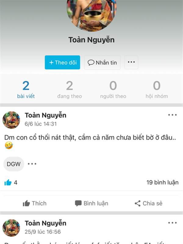 Toản Nguyễn khi nào mà tao đăng lên viết chửi bậy, ăn nói mất dạ.y thì m hãy mò vào nói hay chửi. Còn tao viết cảm nghĩ của tao mày vào chửi lại là chuyện khác