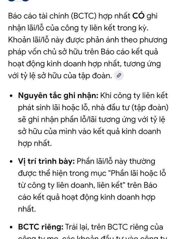 Nguyên Đầu Tư Giá Trị Do lợi nhuận của cty mẹ chủ yếu đến từ cổ tức của con nên nó mới lệch pha như thế. Bc tài chính hợp nhất nó có phần lãi lỗ trong cty liên kết nên nó phản ánh ngay kết quả của cty con. Còn báo cáo riên...Thêm