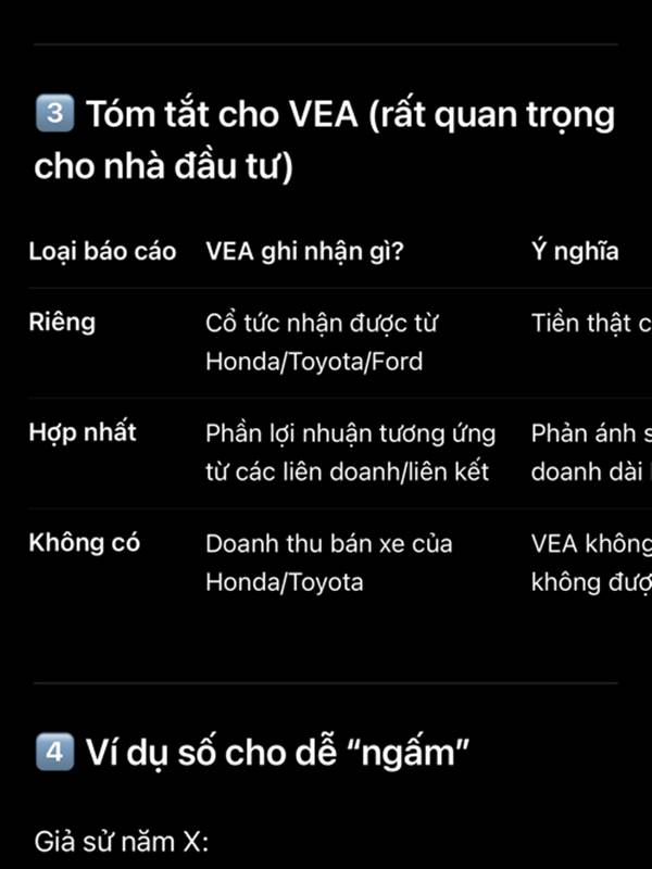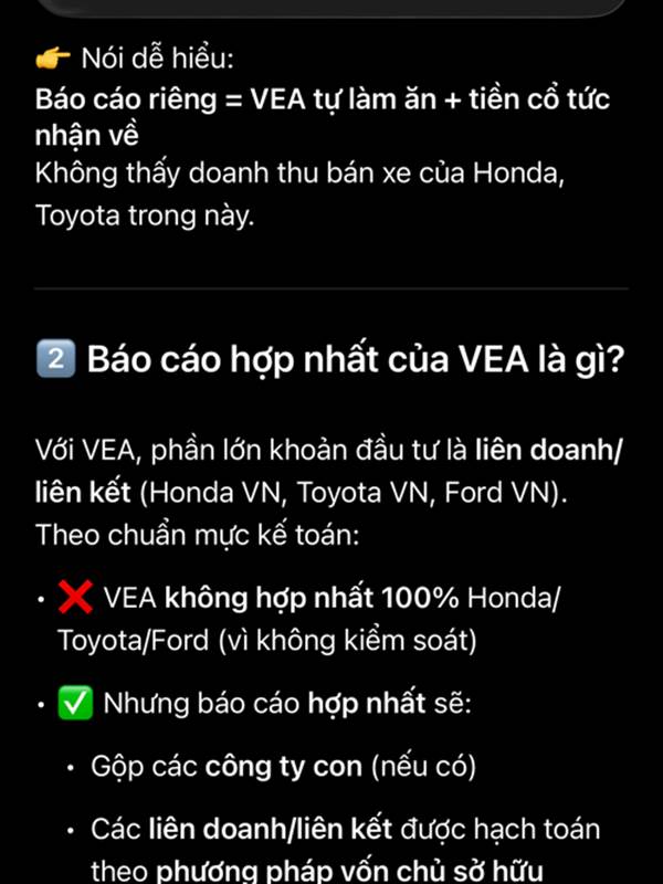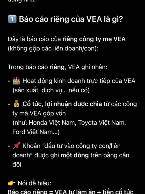 Hợp nhất = VEA + cty con + cty liên kết. Ví dụ Vea quý 4 lời 500tỷ, nhận cổ tức 300 tỷ báo cáo riêng là 800...Thêm