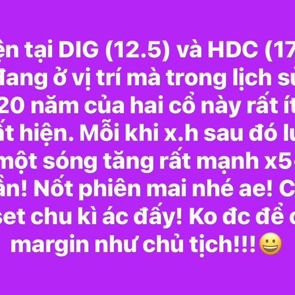 Trong lịch sử DIG; HDC, theo thống kê của mình từ khi lên sàn đến nay, mỗi lần xuất hiện volume lớn sau một chu kỳ giảm dài, thường sau đó 1–3 tháng cổ phiếu sẽ có một nhịp tăng cực lớn bằng lần! 11/0...Thêm