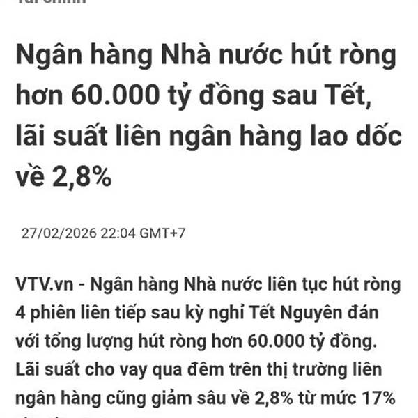 Lãi suất liên ngân hàng qua đêm đã giảm từ 17% về 2,8%