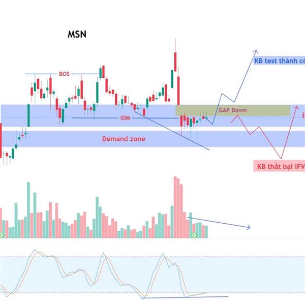 MSN đang dao động trong vùng iFVG, sau nhịp giảm mạnh kèm khối lượng, hiện tại khối lượng suy yếu dần → áp lực cung bán tạm thời dừng lại kiểm định iFVG - Stoch khung D chạm v...Thêm