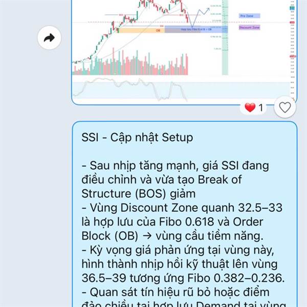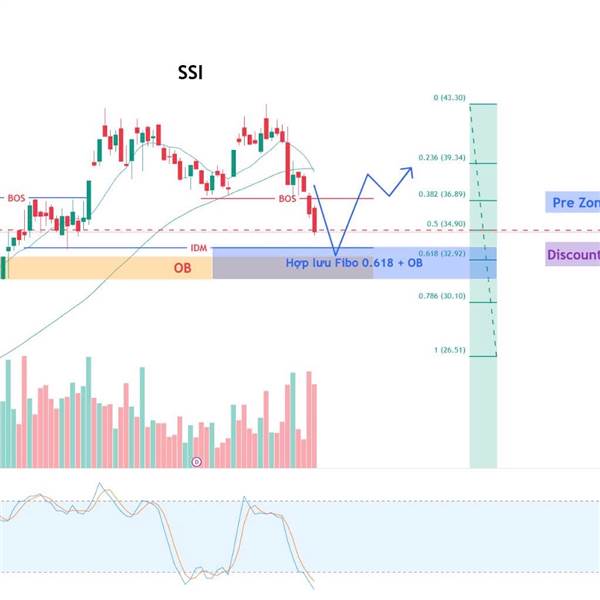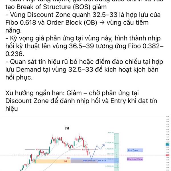 - Sau nhịp tăng mạnh, giá SSI đang điều chỉnh và vừa tạo Break of Structure (BOS) giảm - Vùng Discount Zone quanh 32.5–33 là hợp lưu của Fibo 0.618 và Order Block (OB) → vùng cầu ti...Thêm