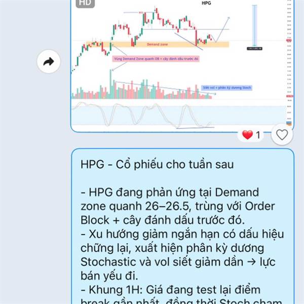 - HPG đang phản ứng tại Demand zone quanh 26–26.5, trùng với Order Block + cây đánh dấu trước đó. - Xu hướng giảm ngắn hạn có dấu hiệu chững lại, xuất hiện phân kỳ dương Stoc...Thêm