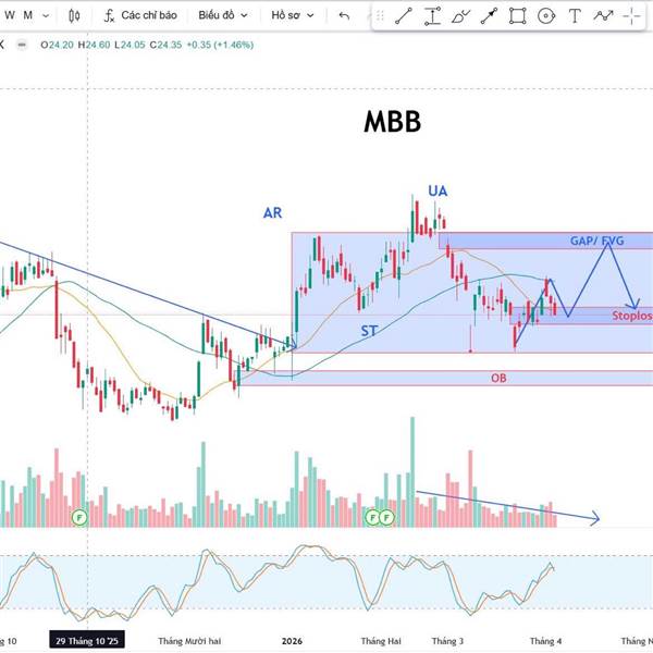 - Chart W: Sau Spring C → Test/ LPS -> SOS, đang test lại nền -> pha D/BU - Khung 4H: Đang quét sellside liquidity + về OB (22-23) Giá giữ được OB + trendline + MA50 -> kết hợp St...Thêm
