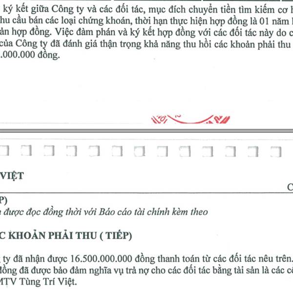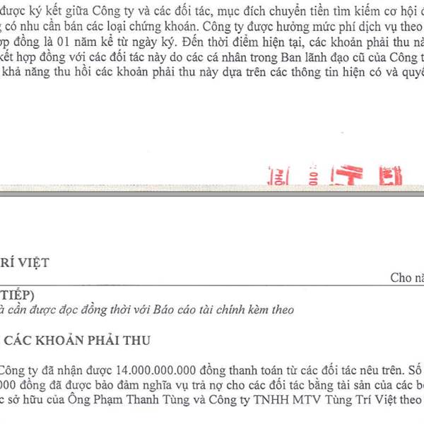 Trong BCTC kiểm toán năm 2023, tại Thuyết minh số 11, khoản phải thu khó đòi chưa trích lập dự phòng của TVB được ghi nhận là có tài sản bảo đảm bằng cổ phiếu thuộc sở hữu của Ông Phạm Thanh Tùng và C...Thêm