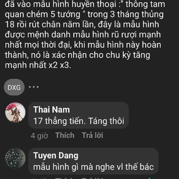 Nếu hôm nay dxg không bung 18 , thì dxg đã vào mẫu hình huyền thoại :" thông tam quan chém 5 tướng " trong 3 tháng thủng 18 rồi rút chân năm lần, đây là mẫu hình được mệnh danh mẫu hình rũ rượi mạnh n...Thêm
