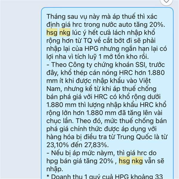 Tháng sau vụ này mà áp thuế thì xác định giá hrc trong nước auto tăng 20%. hsg nkg lúc ý hết cưả lách nhập khổ rộng hơn từ TQ về cắt bớt đi sẽ phải nhập lại của HPG n...Thêm