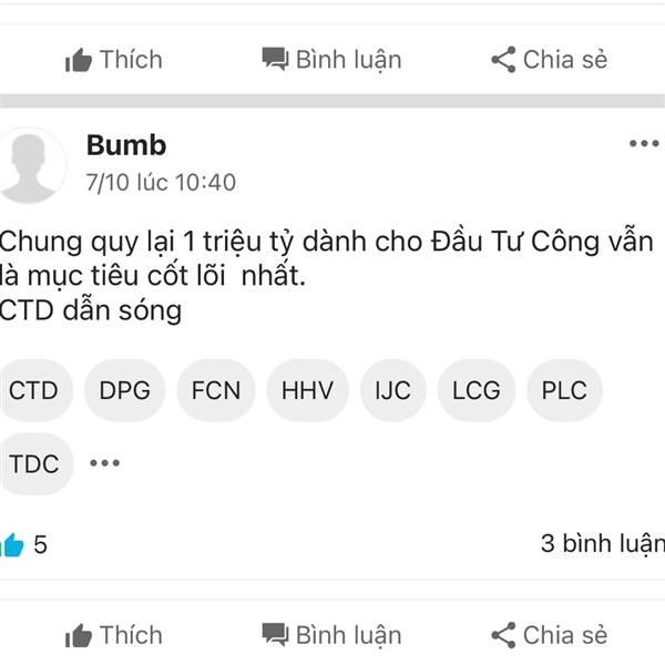 Đã bảo CTD dẫn sóng rồi. Cuối năm thì cứ Đầu Tư Công làm tới. Tiền bắt buộc phải bơm và bơm không bơm vào ĐTC thì bơm chỗ nào. Giờ chỉ có ĐTC mới tạo ra chuỗi giá trị thôi. -> ĐTC, Vật Liệu Xây Dựng- > B...Thêm
