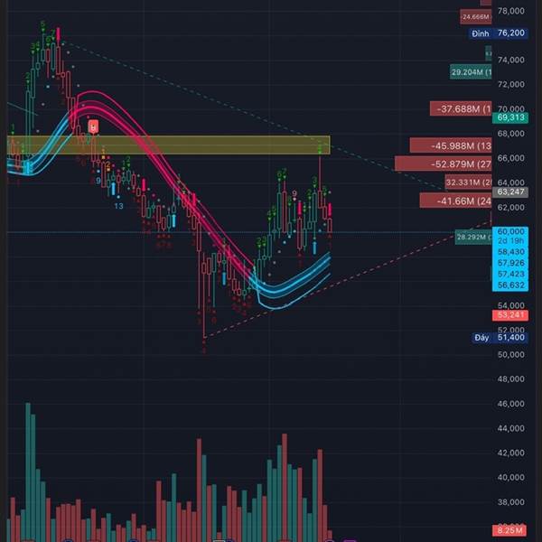 Những ai cầm vnm cũng cần để ý vùng giá có thể về đến 57.5 đường trend trung hạn, nếu phá vùng 57.x thì có thể sẽ tạo đáy sâu hơn.