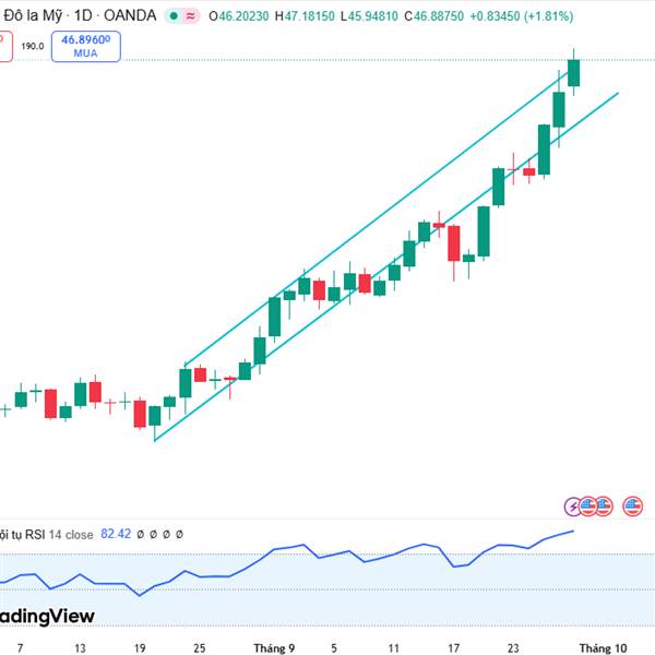 Bạc vừa đạt 46,28 USD/oz, cao nhất nhiều tháng. RSI ở vùng quá mua → khả năng điều chỉnh ngắn hạn, nhưng xu hướng chính vẫn là tăng nhờ: