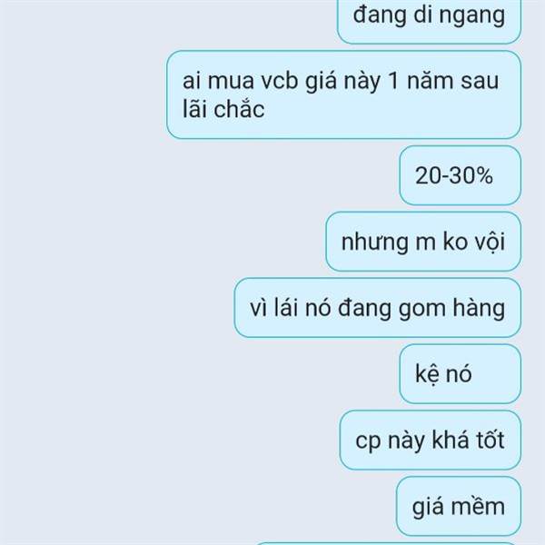 VCB ngon bổ rẻ ko mua đu vin dễ kẹp lắm. vin đang cao kẹp là hay ra đảo. - đoạn cuối tiền đánh xoay vòng cp mỗi cp lái kéo 3-5 hôm. - ai đu sau hay dính giảm.