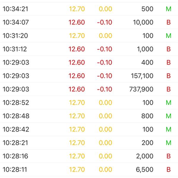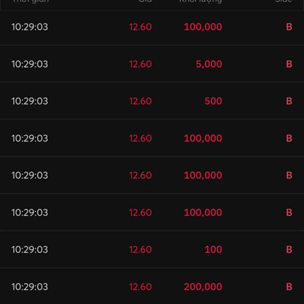Có phải mua-bán trao tay k??? Bên Mua (có khoảng 10 lệnh to đối ứng hơn 900k) đã vào lệnh sẵn rồi thì bên Bán cứ bán xuống 12.6 sang tay qua thôi, trung bình giá trong phiên giảm xuống ngay và tạo thê...Thêm