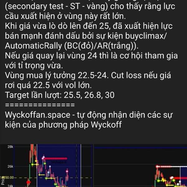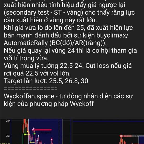 VPB: Đã hình thành vùng giao dịch 26.6-30 ============== Những sự kiện automatic rally (AR-trắng) và secondary test (ST-vàng) đã xuất hiện, xác nhận vùng giao dịch với biên dưới đánh dấu bằng sự kiện se...Thêm