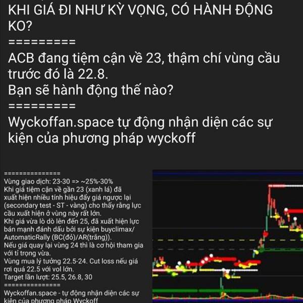 ACB: Thăm dò ==================== ACB đã về gần lại 24, cơ hội để vào thăm dò một ít tránh nhỡ tàu. Giá mua trông đợi là 23 nhưng không biết có được như ý muốn. ==================== Wyckoffan.space