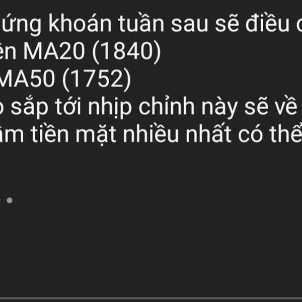 Thị trường chứng khoán tuần sau sẽ điều chỉnh mạnh ! Hỗ trợ đầu tiên MA20 (1840) Hỗ trợ thứ 2 MA50 (1752) Khả năng cao sắp tới nhịp chỉnh này sẽ về hỗ trợ MA50 là rất cao ! Cầm tiền mặt nhiều nhất có t...Thêm