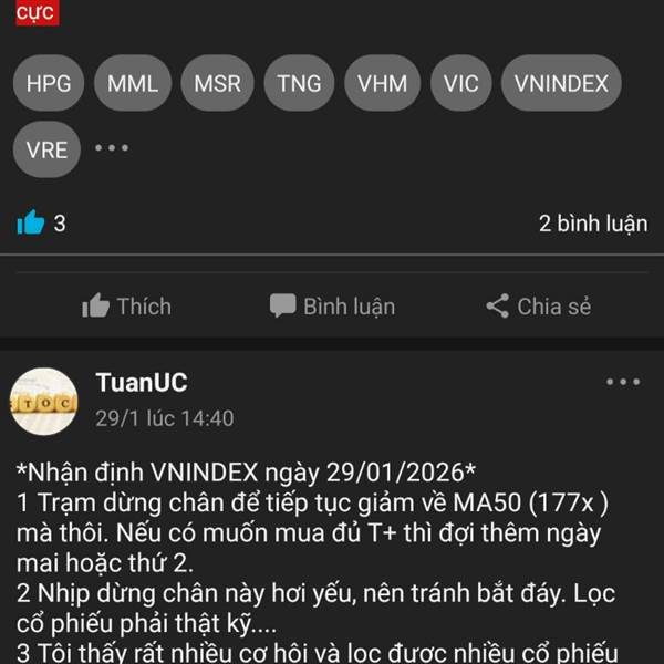 *Nhận định VNINDEX ngày 29/01/2026* 1 Trạm dừng chân để tiếp tục giảm về MA50 (177x ) mà thôi. Nếu có muốn mua đủ T+ thì đợi thêm ngày mai hoặc thứ 2. 2 Nhịp dừng chân này hơi yếu, nên tránh bắt đáy. Lọ...Thêm