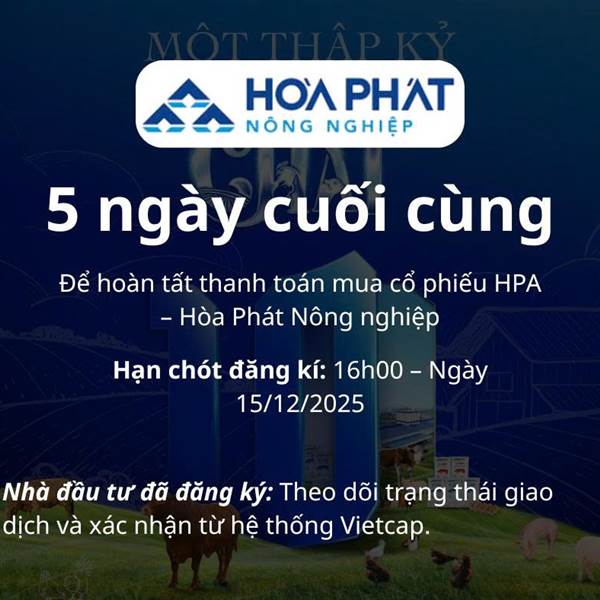 Chỉ còn 5 ngày để hoàn tất thanh toán mua cổ phiếu HPA – Hòa Phát Nông nghiệp.