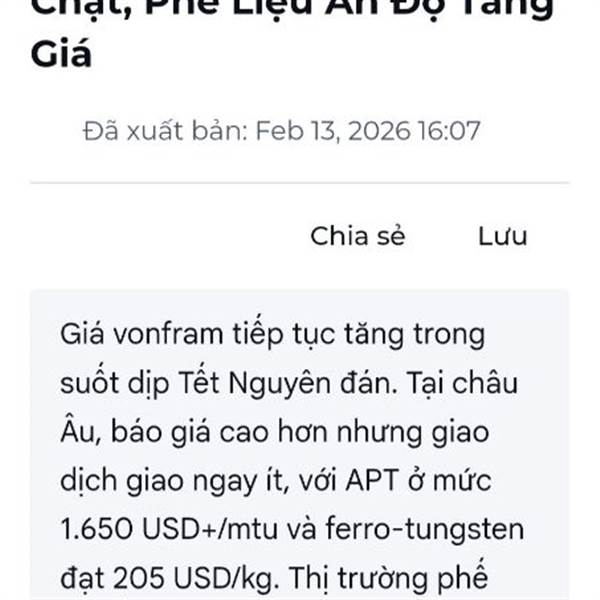 2. Giá bán thành phẩm tăng rất cao. Đặc biệt là từ tháng 10/2025. Giá vonfram bình q...Thêm