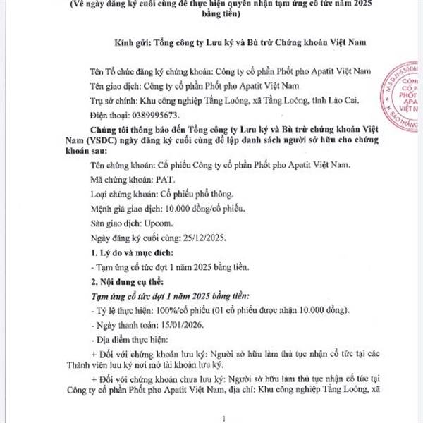 Nhận mấy trăm tỏi cổ tức từ công ty con.