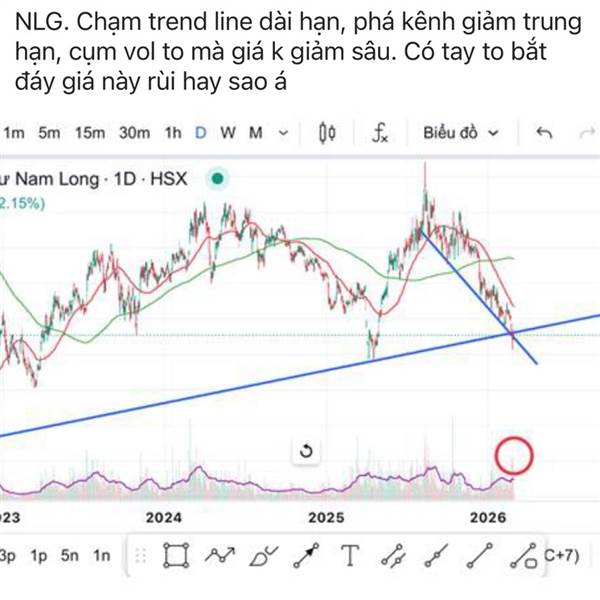 NLG. Chạm trend line dài hạn, phá kênh giảm trung hạn, cụm vol to mà giá k giảm sâu. Có tay to bắt đáy giá này rùi hay sao á