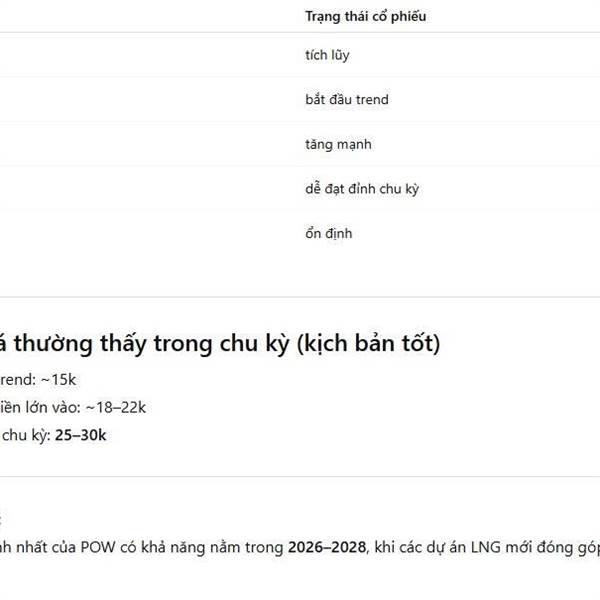 2026 POW SẼ BƯỚC VÀO TREND TĂNG TRƯỞNG MẠNH TRỞ LẠI KHI CÁC DỰ ÁN KLNG ĐI VÀO HOẠT ĐỘNG VÀ CÁC HỢP ĐỒNG MUA BÁN KHÍ LNG ĐƯỢC KÝ KẾT. THEO MÌNH ĐÁNH GIÁ POW HIỆN TẠI GIÁ ĐANG RẤT HẤP DẪN TRONG 2026 SO ...Thêm