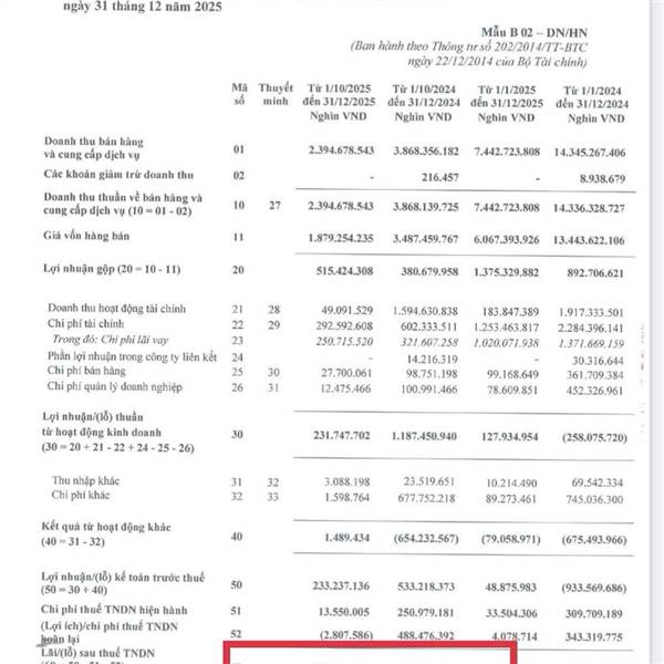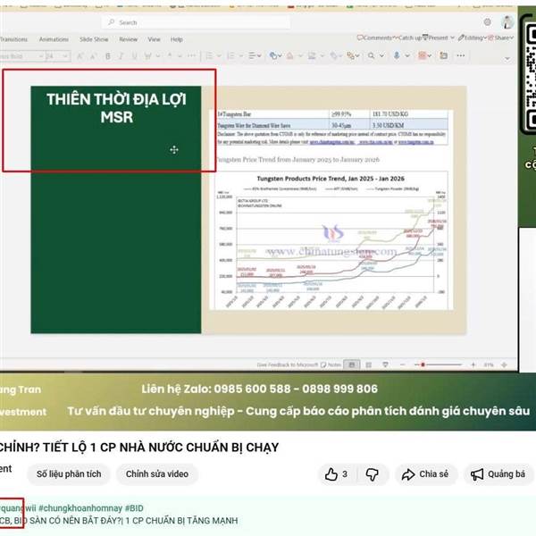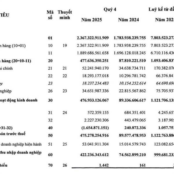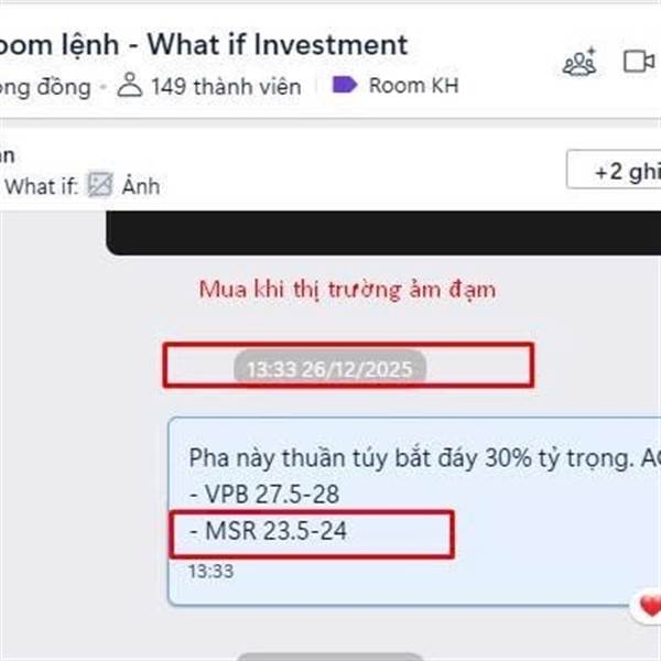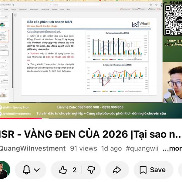 MSR (Masan High-Tech Material): Q4/2025, tổng doanh thu ghi nhận 2,395 tỷ đồng (-38% svck, loại trừ HCS là tăng 7% svck), trong đó doanh thu từ các mảng APT và Flourit tăng 33%/7% svck. Biên LN gộp đạ...Thêm