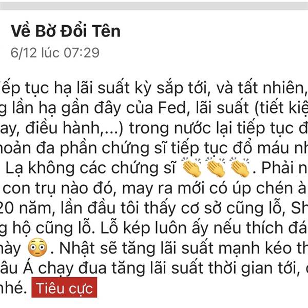 Vài tháng trước khi Fed hạ lãi suất lần đầu thì t đã chắc nịch lãi suất trong nước tăng phi mã rồi, vượt 20% hoặc 30% đối với thế chấp chỉ là chuyện sớm muộn trong thời gian tới, lãi đỉnh thời kỳ trướ...Thêm