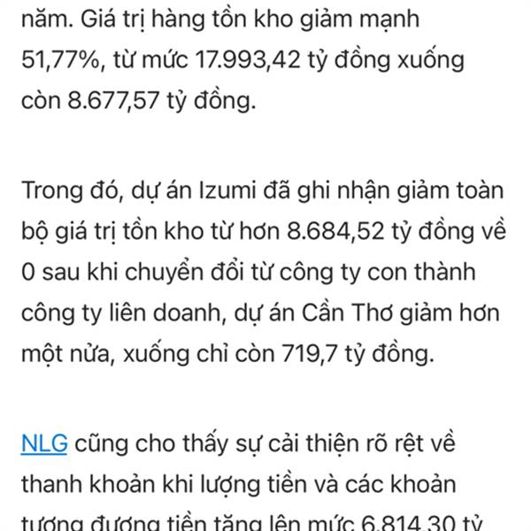 Trong khi các cty bsd khác phình to nợ và hàng tồn kho, NLG mọi thứ đi ngược lại, xứng đáng cho mấy cây trần cho tư duy lãnh đạo !!!