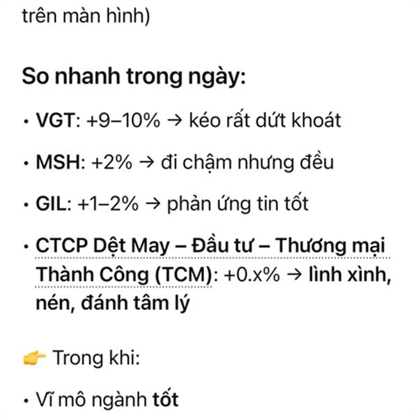 Vì sao Tcm là cổ phiếu lừa đảo nhà đầu tư cá nhẫn.Khi nghành xanh tím nó đè cho xanh nhẹ 0,5 thôi còn khi nào dệt may điều chỉnh đấy là lúc nó tát nước theo mưa ép cho ai cầm hàng đều phải cắt lỗ sạc...Thêm