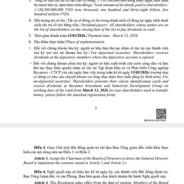BCM: nghị quyết về cổ tức bằng tiền 💰🎉 Ngày chốt danh sách: 13/02/2026. Tỷ lệ thực hiện: 11%. Ngày thanh toán: 13/03/2026. Nhận xét: ý chí của lãnh đạo quá rõ: cho bọn tây bán hết xong chốt cổ tức tiền ...Thêm