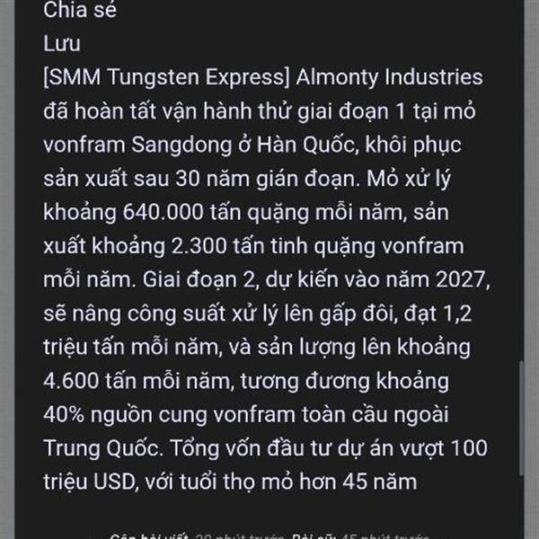 Mỏ Vonfram Sandong tại Hàn Quốc chuẩn bị đi vào hoạt động (sản lượng hơn Núi Pháo). Vậy lý do là giá Vonfram hiện tạm thời đã đạt đỉnh. Cần theo dõi biến động giá Vonfram trong trung hạn.
