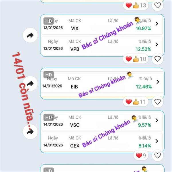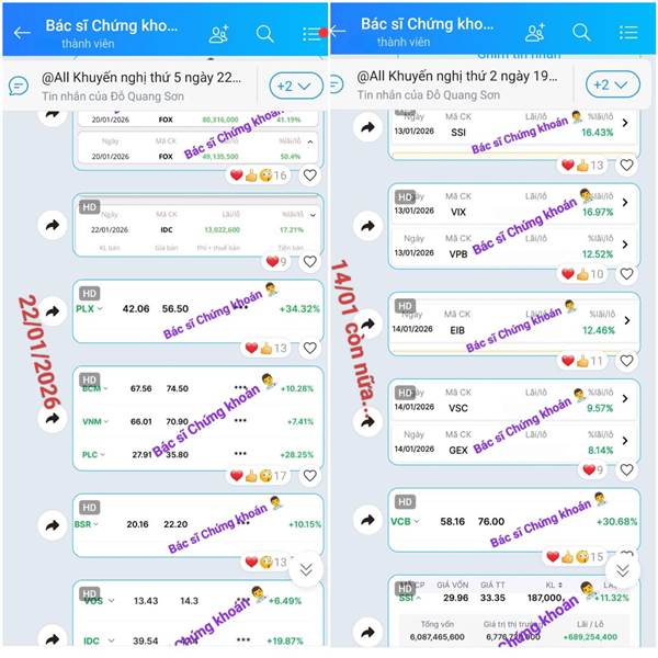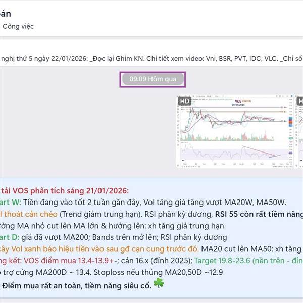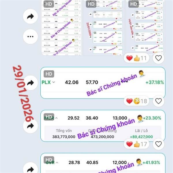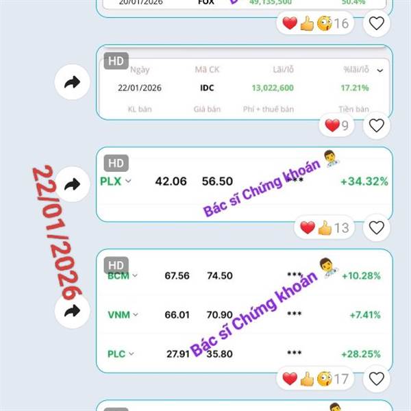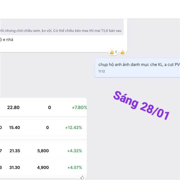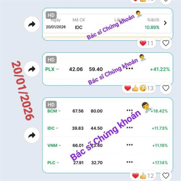 20/01/2026: Danh mục vẫn xanh tím 😁 _Siêu cổ Dầu khí PLC, PLX trần; IDC, VNM, BCM, ACV, VLC,... xanh đẹp. 🎁 _FOX qua bán hớ mà +32% (T+3) cũng tạm. _Đoạn này lại cứ thích đánh Upcom, biên 15% phát một ...Thêm