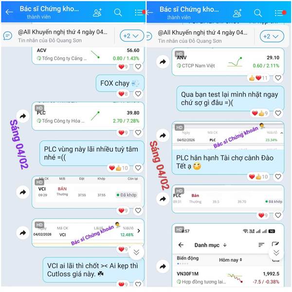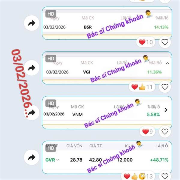 04/02/2026: PLC chốt lời 23% T+ 😁 _Qua 03/02 cũng chốt PVC +18%; BSR +14%; VGI +11%; VNM +5%,...💵 _Nay có VOS tím, VGC, FOX +3%, con nào chưa tăng mấy thì nuôi thêm tí cho béo: ANV, PLX, ACV,...🎁 _Thứ...Thêm