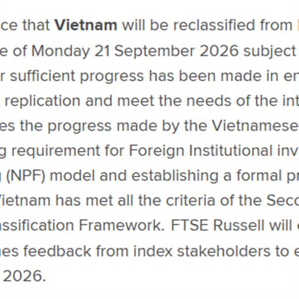 FTSE chính thức nâng hạng cho thị trường chứng khoán Việt Nam.