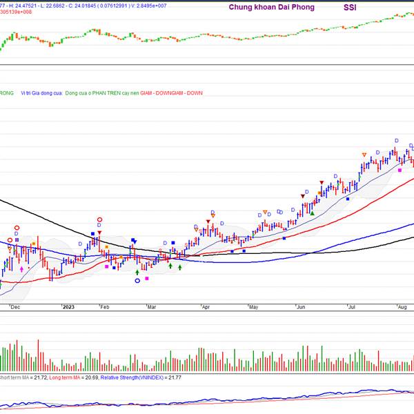 ĐỈnh chu kỳ SSI gần nhất là 2023. Khi cổ phiếu tăng 80% từ nền tích lũy và tạo Buying Climax cùng ngành chứng khoán. Quá trình tạo đáy quanh MA200 và hồi phục lại để đánh dấu kết thúc Phase A