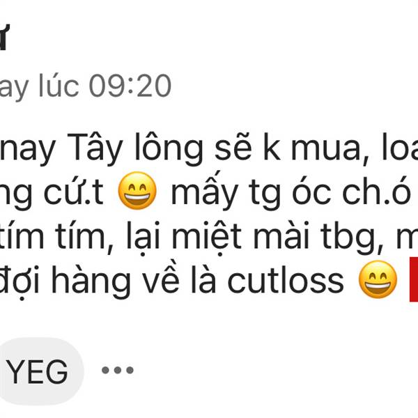 Kịch bản là nay Tây lông sẽ k mua, loanh quanh lại về vs đống cứ.t 😄 mấy tg óc ch.ó ko não lại tiếp tục hô tím tím, lại miệt mài tbg, mơ mộng ng.u xuẩn, đợi hàng về là cutloss 😄